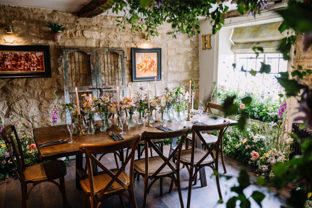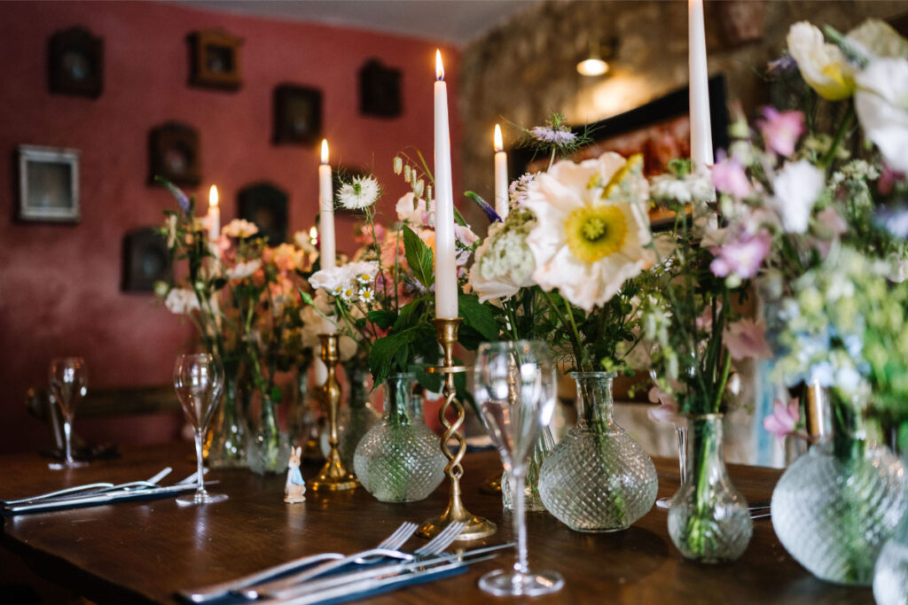 The intimate private dining room at Huxley’s, a 500-year-old building in the heart of Chipping Camden was transformed into a magical meadow garden. Rambling roses, clematis, and wildflowers surrounded guests. We created a natural climbing flower installation growing up the room’s ancient beams, using British grown early summer flowers. Vintage glass bud vases and antique brass candlesticks added to the relaxed, romantic charm. We made up a playful potting-shed corner which Yukina’s mother just loved being a fan of Peter Rabbit. This playful touch completed the room full of English charm for their families to enjoy.