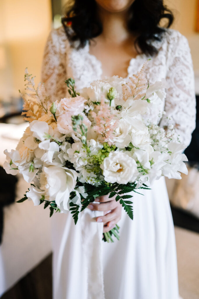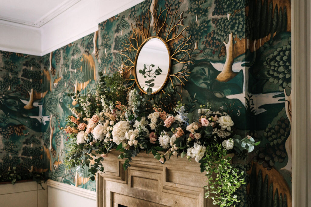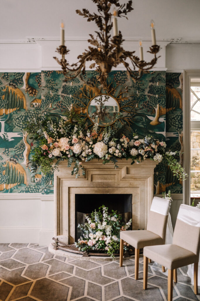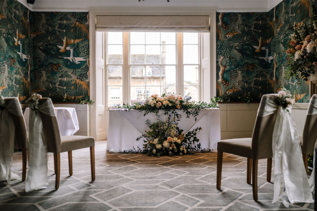 Their intimate ceremony took place in the delightful dining room of this beautiful Chipping Campden hotel. Using luxurious hydrangeas, roses and other seasonal flowers in soft blush, powder pink, and ivory with delicate seasonal foliage. Arrangements complemented the hotel’s William Morris wallpaper, antique mirrors, and sparkling chandeliers, creating an air of romantic, country house Bridgerton inspired elegance. Yukina’s delicate bouquet made using airy peonies, roses, and sweet peas was perfect with her gorgeous lace and chiffon dress, as she walked down the aisle for their intimate wedding ceremony.